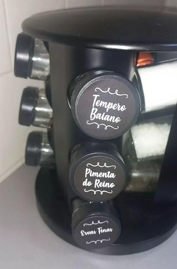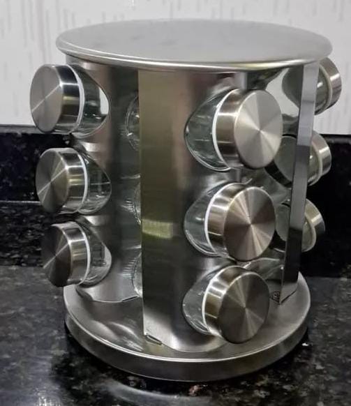 Porta-Condimentos em Inox com Base Giratória e 12 Potes de Vidro. Design moderno, prático e ideal para organização da cozinha. Disponível também na versão em plástico.